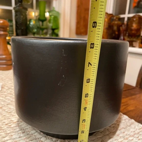 1960s Modern matte Black Mid CenturyArchitectural Planter Pot8 tall x 10 diameterBlack planter garden patio homeStyle of Gainey Pottery. Signed underneath with maker's label.Original preowned unrestored vintage condition. No cracksA couple of paint chips see pic Elegant black ceramic planter. Perfect for indoor plants.