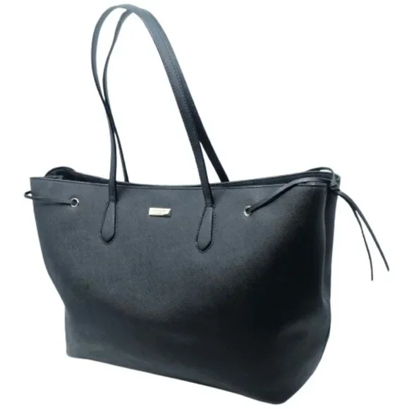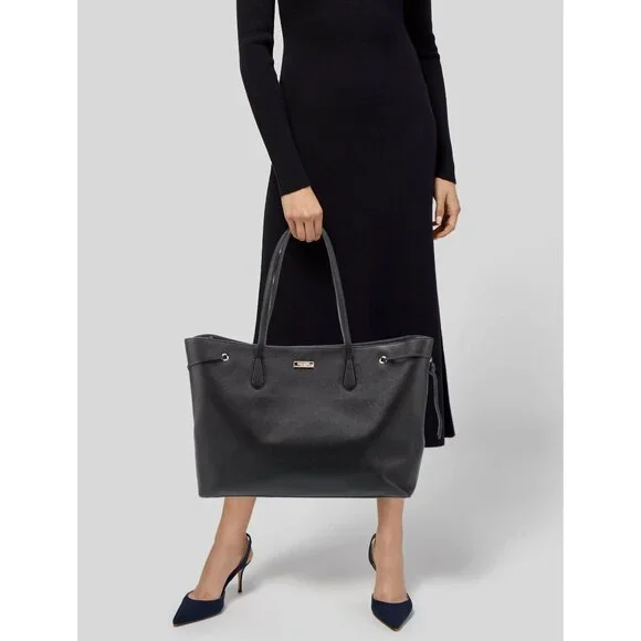 This is a Kate Spade ARI LAUREL WAY Extra Large Black Leather Tote BagThis EXTRA LARGE bag can tote your laptop and all your staples!BLACK SAFFIANO LEATHERGOLD TONE HARDWARE MAGNETIC SNAP CLOSURESTUDDED BASEInterior:1 ZIPPER POCKET & 2 SLIP POCKETS 9" STRAP DROP18"W x 12"H x 5"DThis bag is in Excellent Used Condition(one strap has some tiny nicks on edge)SUPER CLEAN